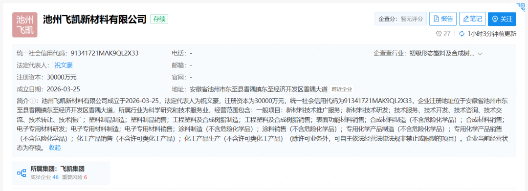 3月25日,企查查信息显示,池州飞凯新材料有限公司已正式成立,注册资本3亿元,经营范围涵盖电子专用材料研发、制造与销售以及涂料制造等,由飞凯材料全资持股。新公司的成立,标志着飞凯材料池州项目已进入实质性推进阶段。