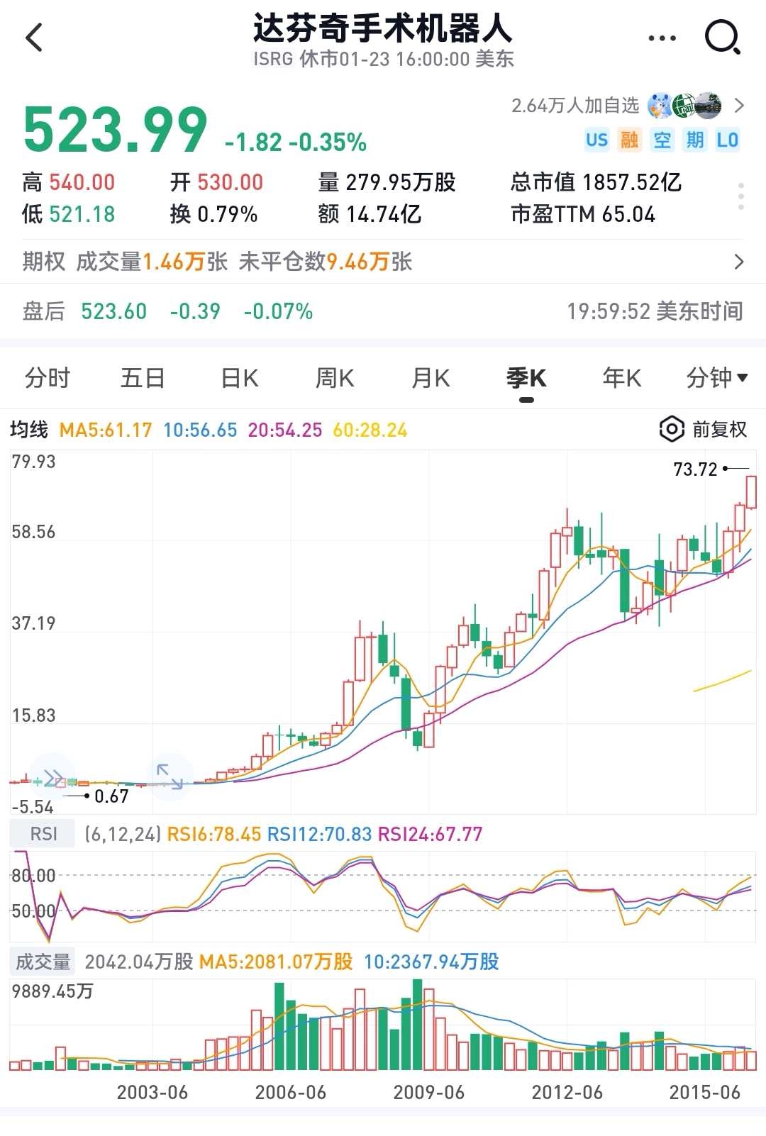 期间不要指望股价的上涨就能一帆风顺,因为,企业基本面的呈现不可能一帆风顺,过程一定会有许多超预期的挑战,另一方面,市场情绪波动周期注定也不可避免。所以,过去的微创机器人股价曾经经历过大起大落,未来也一定还会大起大落。附图是达芬奇早期的股价走势图,这么优秀的一家打遍天才无敌手的牛掰公司,他在上涨几百上千倍的过程也是充满曲折的,腰斩就是家常便饭。所以在买入的微创机器人的同时就将这笔投资清零或许会让自己的持股体验更好一点。