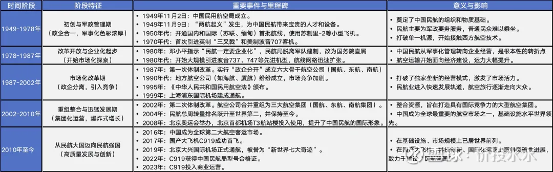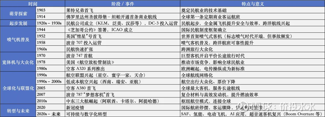 世界民航业从1903年莱特兄弟试飞开始,经历了"萌芽探索 -> 起步发展 -> 喷气式飞机普及 -> 宽体机与大众化 -> 全球化与联盟化 -> 转型与未来" 多个不同的发展阶段。到今天,民航业经过了100多年的发展,已经从最初的新“科技”行业,进入了技术成熟期和商业应用的稳定盈利期。