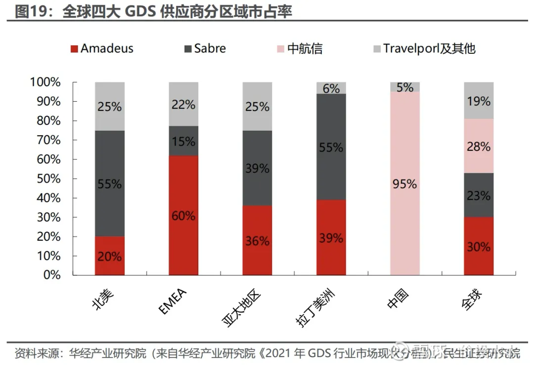 从全球来看,GDS公司呈现出非常明显的区域垄断性,在中国市场中航信一家独大占据95%的市场份额,并且依靠在中国市场的绝对垄断地位占据了全球市场28%的市场份额。