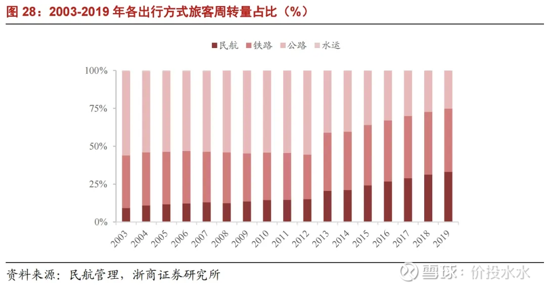 在 2003-2019 年期间,民航运输占比提升了约 24%,高于铁路旅客运输周转量提升的 6.9%;而公路运输的占比下降约 30.7%。在此期间,民航运输的渗透率远高出铁路旅客运输的渗透率17.1%,是渗透速度最快的出行方式。