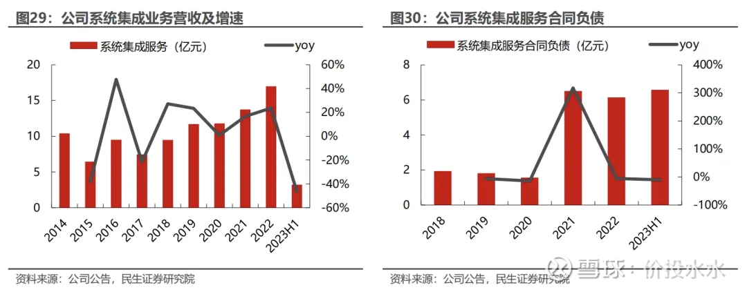 系统集成业务收入主要来源于向机场、航司及其他机构客户提供的硬件集成、软件集成及数据信息集成服务。该业务在客户验收合格后即可确认收入,公司对于该业务的收入确定较为被动,取决于客户项目的开工建设及竣工验收进展。所以我们看到的数据情况呈现出两个比较显著的特点:一是系统集成服务业务伴随机场建设的高增长;二是这部分业务首先体现在合同负债,通过较长时间的机场建设和验收流程,才能体现到财报中的营业收入部分。