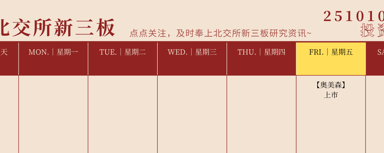 $奥美森(BJ920080)$ 今日上市,证券代码920080,发行价格8.25元。公司是专业的智能装备制造生产商,产品可广泛应用于电器、环保、风电和锂电新能源及其他行业等领域,是实现生产自动化、智能化和高效化的关键装备。自2003年成立以来,深耕热交换和管路加工技术,与国内外主要电器生产企业如格力电器、美的集团、等保持长期稳定合作关系。发行人预计2025年1-12月营业收入、归属于母公司所有者的净利润和归属于母公司所有者的扣除非经常性损益后的净利润分别为37,000至42,000万元,6,000至7,000万元和5,700至6,700万元,同比分别增长3.23%至7.18%、7.48%至25.40%、8.13%至27.10%。