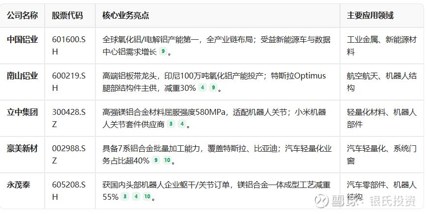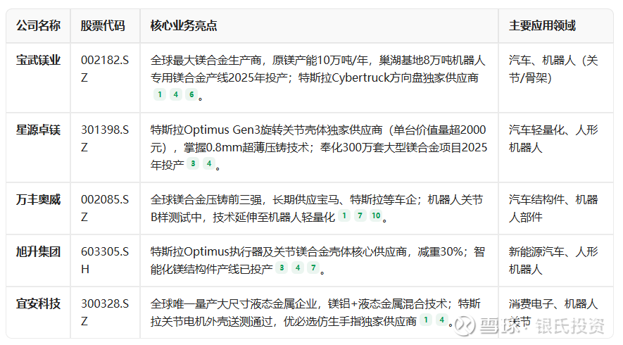 💡 注:以上信息基于公开资料整理,不构成投资建议。需跟踪产能落地(如奉化项目)、镁价波动(当前镁铝价比0.8-0.9)及特斯拉机器人量产进度。更多标的详见雪球分析 。