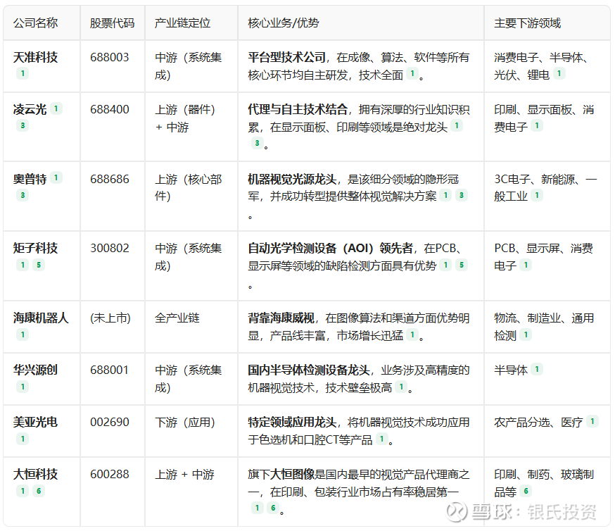 天准科技688003中游(系统集成)平台型技术公司,在成像、算法、软件等所有核心环节均自主研发,技术全面。消费电子、半导体、光伏、锂电凌云光688400上游(器件)+ 中游代理与自主技术结合,拥有深厚的行业知识积累,在显示面板、印刷等领域是绝对龙头。印刷、显示面板、消费电子奥普特688686上游(核心部件)机器视觉光源龙头,是该细分领域的隐形冠军,并成功转型提供整体视觉解决方案。3C电子、新能源、一般工业矩子科技300802中游(系统集成)自动光学检测设备(AOI)领先者,在PCB、显示屏等领域的缺陷检测方面具有优势。PCB、显示屏、消费电子海康机器人(未上市)全产业链背靠海康威视,在图像算法和渠道方面优势明显,产品线丰富,市场增长迅猛。物流、制造业、通用检测华兴源创688001中游(系统集成)国内半导体检测设备龙头,业务涉及高精度的机器视觉技术,技术壁垒极高。半导体美亚光电002690下游(应用)特定领域应用龙头,将机器视觉技术成功应用于色选机和口腔CT等产品。农产品分选、医疗大恒科技600288上游 + 中游旗下大恒图像是国内最早的视觉产品代理商之一,在印刷、包装行业市场占有率稳居第一。印刷、制药、玻璃制品等