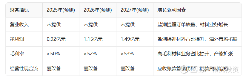短期(2025-2026):机构预测2025年净利润0.92亿元(+73.5%),2026年1.15亿元(+25%),驱动因素为盐湖提锂订单放量及材料业务高毛利。