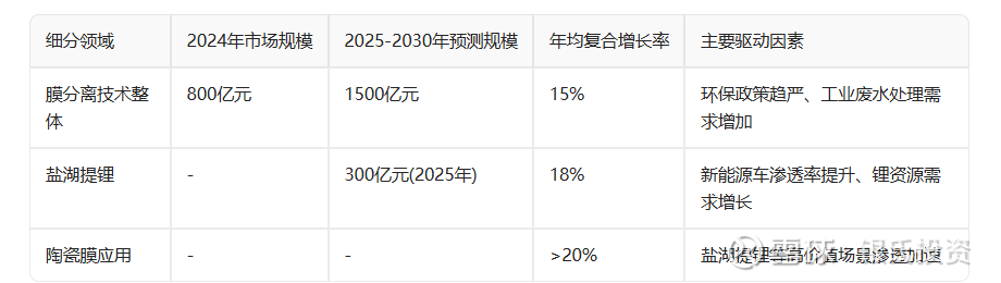 市场空间: 膜分离技术:2024年市场规模超800亿元,预计2025-2030年达1500亿元(CAGR 15%),陶瓷膜在盐湖提锂领域增速超20%。 盐湖提锂:2025年全球市场规模将达300亿元(CAGR 18%),受新能源车渗透率提升驱动。