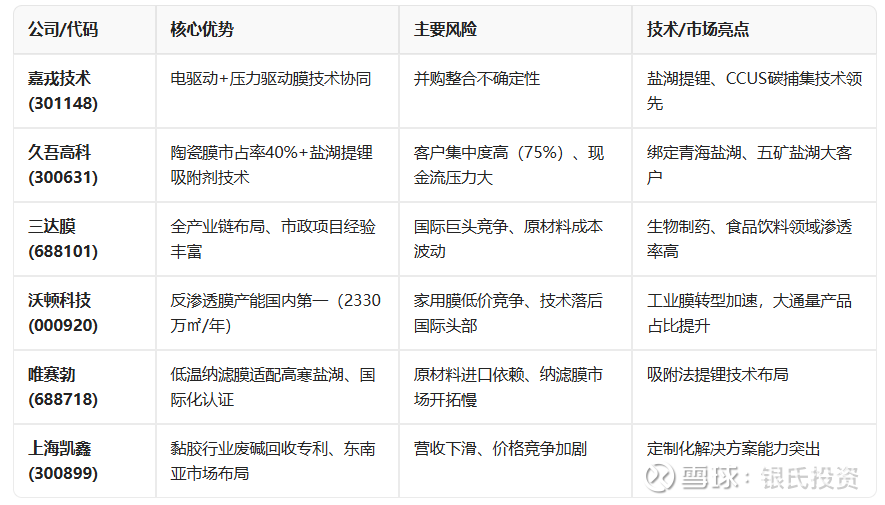 优势: 技术协同:收购杭州蓝然后,整合压力驱动膜(超滤/反渗透)与电驱动膜(电渗析/双极膜),形成盐湖提锂、锂电池回收的完整工艺闭环。 新兴市场布局:切入碳捕集(CCUS)领域,双极膜技术可将工业尾气中的CO₂转化为高价值化学品。