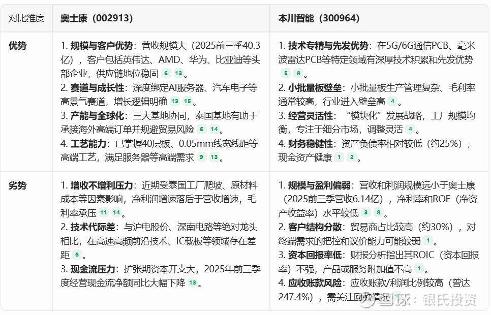 奥士康是成长赛道明确、具备规模化和全球化潜力的中型厂商,投资逻辑在于跟踪其高端产能兑现和利润拐点,适合关注产业趋势、能承受一定扩张期阵痛的投资者。本川智能是细分领域技术领先的小而美公司,投资逻辑更偏向主题性和技术壁垒,波动可能更大,适合对通信技术前沿有深入研究、能接受高估值和高风险的投资者。两者代表了PCB行业两种不同的发展路径和投资风格。
