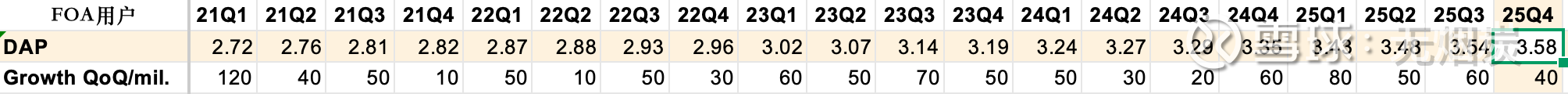 25Q4 FOA应用家族日活用户数增量继续增长4000万,DAP达到35.8亿,其中FB和WhatsApp日活均超过20亿,继续发挥社交通讯平台强者恒强的网络效应。