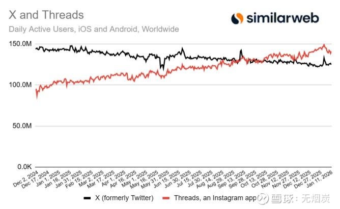 根据近期Similarweb的数据,Threads在移动端的 DAU已经达到1.415亿,超过推特同平台的 1.25 亿。