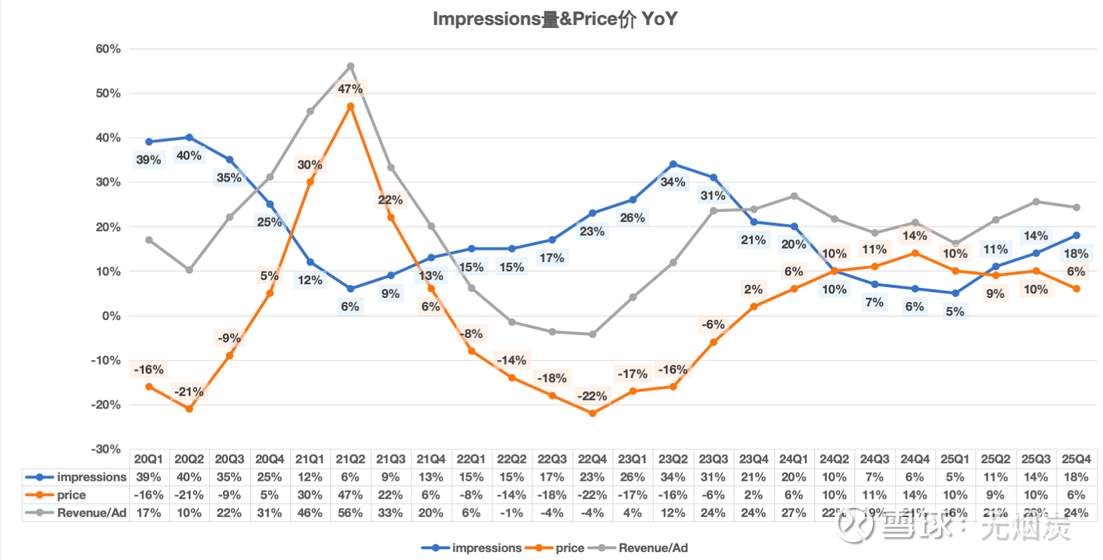 25Q4广告营收实现同比增长24.3%至581亿,其中广告展示次数增速18%,广告单价增速6%。广告展示量方面,增长非常健康,主要来自平台活跃度和用户数增长,而非加广告,“所有地区的展示量均实现稳健增长,核心驱动力为用户互动与用户规模的提升,广告加载优化的贡献则相对较小。”广告价格方面,增长主要由广告效果提升驱动,“广告平均单价同比上涨 6%,得益于广告主需求的增长,而这一需求增长主要由广告效果的提升所驱动。”