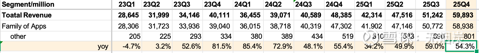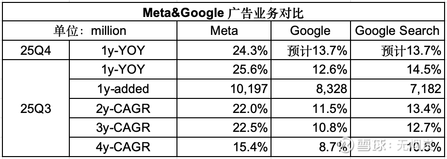 Meta广告收入在25Q4同比增速24.3%,大概率继续大幅超过谷歌(尚未披露最新季报)。