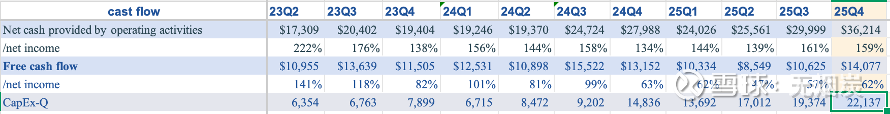 公司25Q4的经营活动现金流362亿,资本支出221亿,自由现金流141亿(同比增长 7%),现金流目前整体仍然强劲。