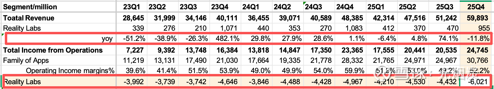 RL部门25Q4亏损扩大至60亿,全年合计亏损192亿,预计26年跟25年一样亏损在190亿左右并达峰,明年开始迎来拐点收窄亏损,“(RL部门)聚焦两大目标:一是让 Horizon 在移动端取得巨大成功,二是在未来几年内将 VR 打造为盈利的生态系统。我预计现实实验室今年的亏损规模将与去年持平,而这一亏损水平很可能已达到峰值。在持续践行我们愿景的同时,我们将逐步实现亏损收窄。”在经过25年一整年的观察后,最终将元宇宙 26 年的预算支出砍掉 30%便是这一展望的落地执行动作。