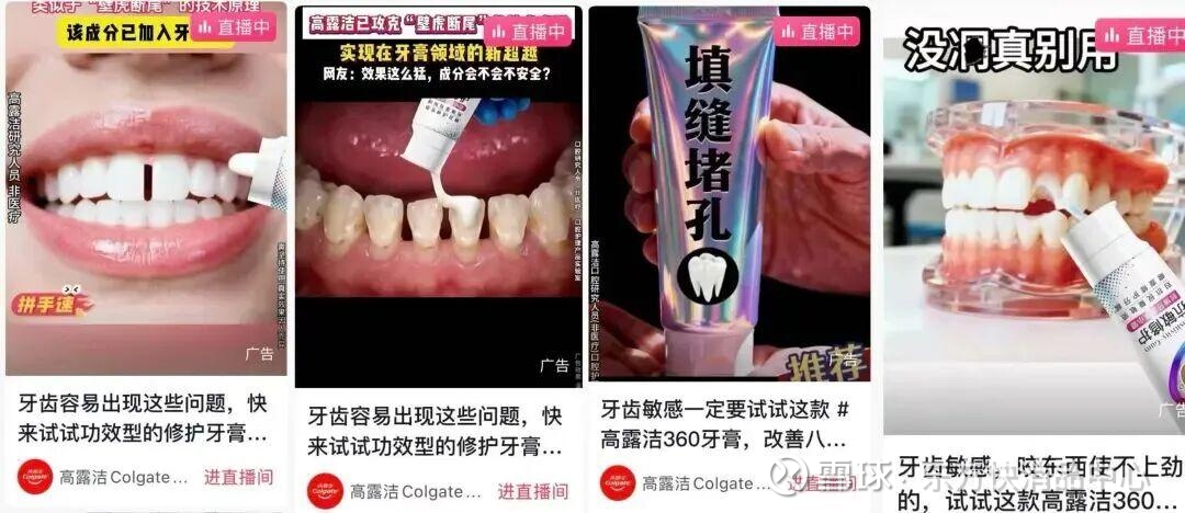 《快消品》了解到,涉事账号“高露洁colgate口腔修护牙膏直播间”为高露洁旗舰店授权账号,其产品链接均跳转至高露洁Colgate官方旗舰店。截至发稿,被指侵权的视频已从涉事账号主页下架,但该直播间仍在正常开展带货活动。高露洁的违规营销并非个例。在抖音平台以“牙膏”为关键词搜索可见,多个高露洁官方推广视频封面使用“壁虎断尾求生”“填缝堵孔”“没洞真别用”等夸张宣传语,其中涉事直播间2025年1月10日发布的“攻克壁虎断尾求生”视频,截至发稿前也已下架。