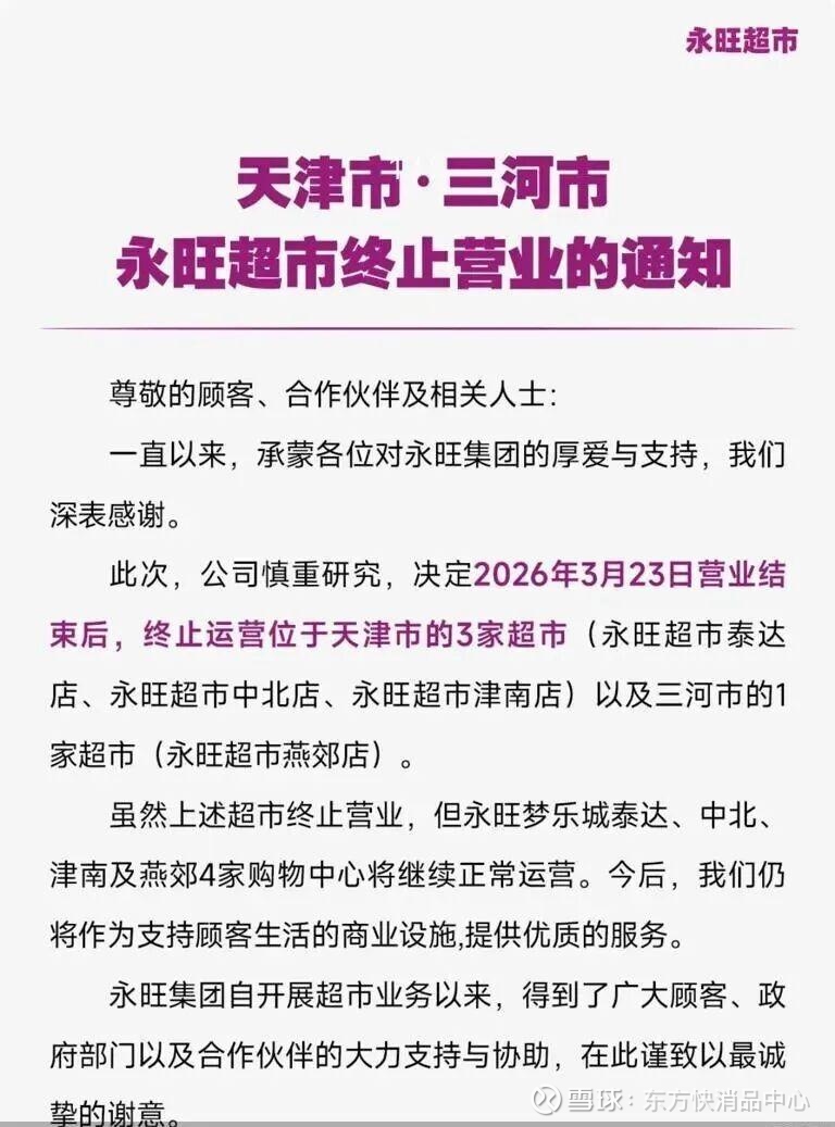 《快消品》了解到,此次终止营业的4家超市分别为天津区域的永旺超市泰达店、永旺超市中北店、永旺超市津南店,以及河北三河市的永旺超市燕郊店。上述4家门店均将于2026年3月23日营业结束后正式关停,闭店前相关门店将正常开展经营活动,消费者可正常购物、使用永旺购物卡,闭店后未使用完毕的购物卡,可前往天津永旺超市梅江店继续使用或办理退卡手续。