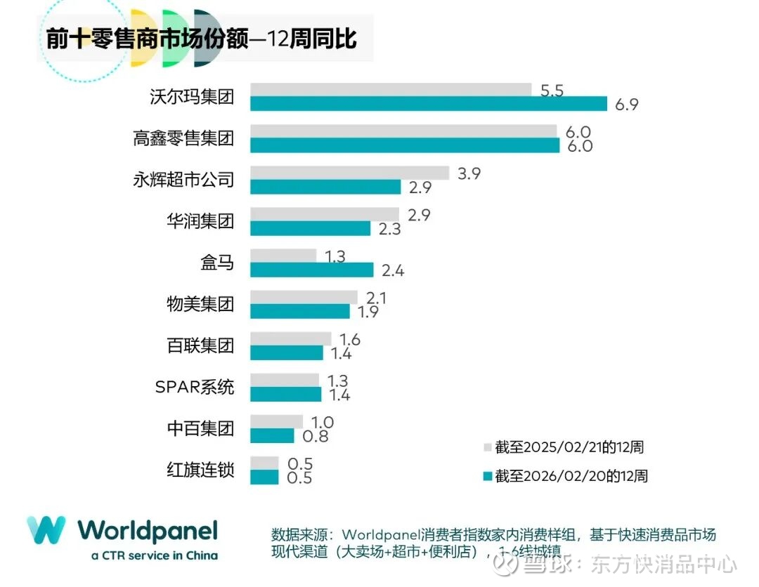 从截至2026年2月20日的12周同比来看,高鑫零售集团以6.9%的市场份额位居前十零售商榜首,沃尔玛集团以6.0%的份额位列第二,两家头部企业份额均较2025年同期提升。盒马以2.4%的份额跻身前五,较2025 年同期增长超 80%,增长势头强劲。此外,物美集团、百联集团、SPAR 系统、中百集团、红旗连锁等区域及本土零售企业,份额均在 2% 以下,市场集中度进一步向头部集中。