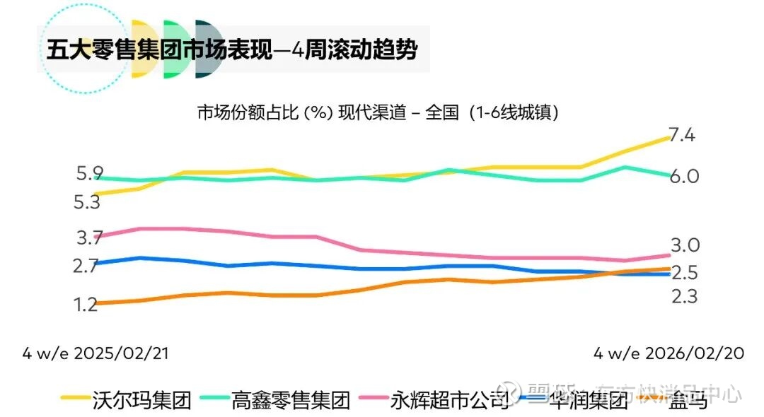 截至2026年2月20日的4周滚动数据显示,沃尔玛集团以7.4%的市场份额位居五大零售集团首位,较2025年同期(5.3%)实现大幅提升;大润发母公司高鑫零售集团(06808.HK)以6.0%的份额紧随其后,与2025年同期基本持平。其余三大集团中,永辉超市(601933.SH)和华润集团都有所回落;盒马份额2.3%,较2025年同期实现近翻倍增长,成为五大集团中增速最显著的主体。