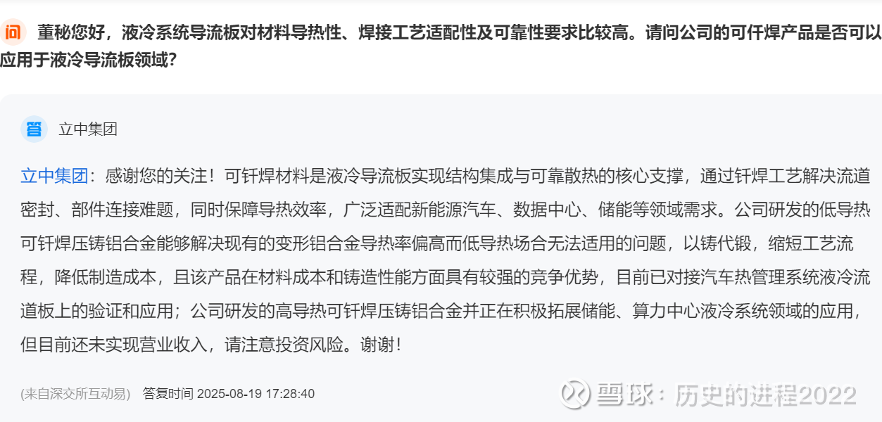【可钎焊材料是液冷导流板实现结构集成与可靠散热的核心支撑,通过钎焊工艺解决流道密封、部件连接难题,同时保障导热效率,广泛适配新能源汽车、数据中心、储能等领域需求。公司研发的低导热可钎焊压铸铝合金能够解决现有的变形铝合金导热率偏高而低导热场合无法适用的问题,以铸代锻,缩短工艺流程,降低制造成本,且该产品在材料成本和铸造性能方面具有较强的竞争优势,目前已对接汽车热管理系统液冷流道板上的验证和应用;公司研发的高导热可钎焊压铸铝合金并正在积极拓展储能、算力中心液冷系统领域的应用,但目前还未实现营业收入,请注意投资风险。】