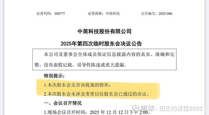 今天中简顺利举行了2025年第四次临时股东会,表决的议案充分反映了广大股东的真实愿望。会议现场气氛良好,议程按部就班,结果我认为是好的。公告也很特别,着重给大家提了醒。