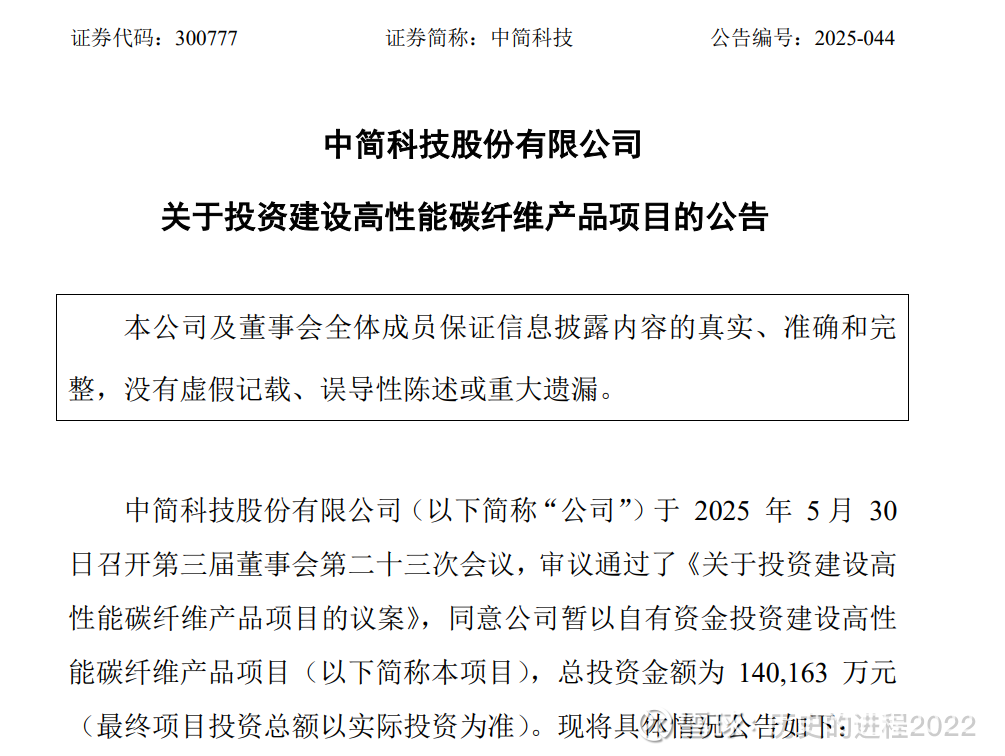回头看,2025年5月30日,中简科技发布公告,公司拟以自有资金投资建设高性能碳纤维产品项目,总投资金额为14.02亿元,项目建设时间预计36个月,项目建设规模为年产2000吨高性能碳纤维(涵盖T700级以上的高强型碳纤维)及配套产品项目,扩大聚丙烯腈原丝、碳纤维及碳纤维织物的生产规模,增加高性能碳纤维的供应量。