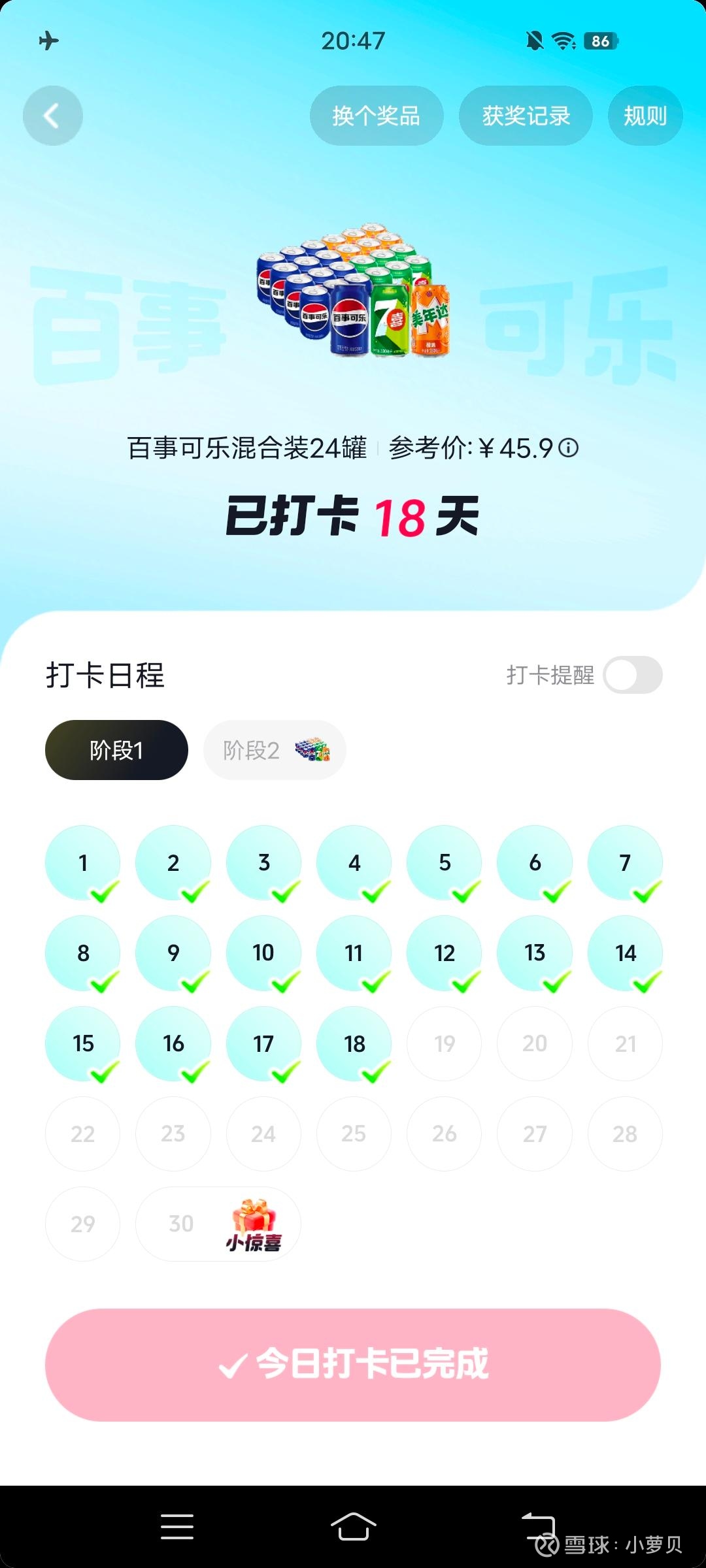 本期打卡的奖品是24瓶百事快乐水,已经坚持了18天,希望他们不要骗我。。。