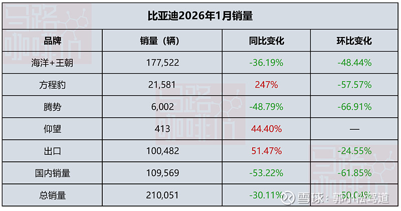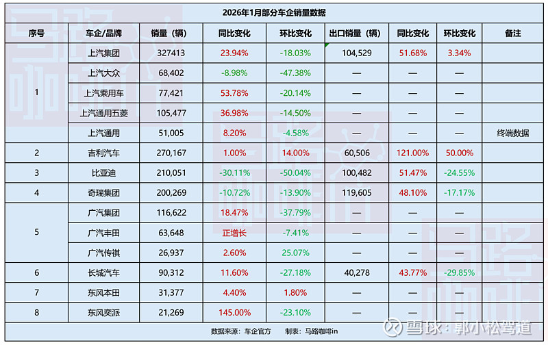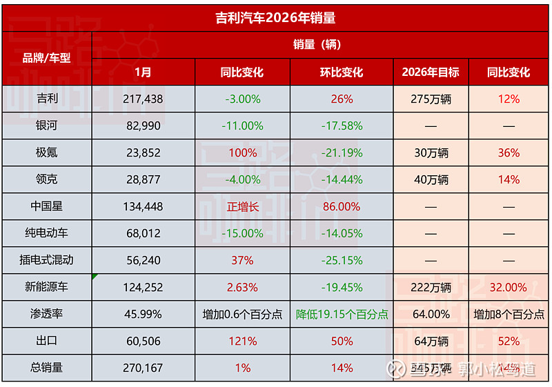 中国车市迎来 “开门黑”,1 月车企销量普遍大跌,核心受新能源车购置税减半征收、以旧换新国补梯次征收、政策落地节奏不一扰动。虽然2026 年 1 月同比表现因为 2025 年同期低基数相对较好,但市场已释放明确信号:具备结构性与体系力优势的车企抗波动能力更强,“偏科生” 风险持续凸显。