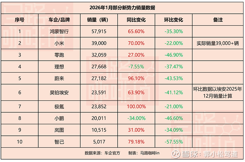 鸿蒙智行、小米、蔚来、极氪的表现都能证明这一点,占据新势力 1 月交付量同比增幅前四,虽均环比下滑,但降幅在新势力中处于低位,凸显高端车型的抗波动能力。