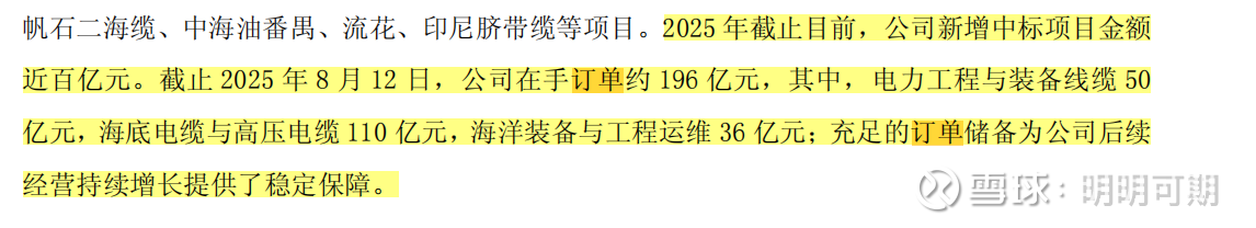 $东方电缆(SH603606)$ 年报中截止1季度在手订单179亿,海缆88亿,而到8月订单规模增加到196亿,不到半年时间多新增在手订单接近20亿,海缆110亿,占比还在提升。参考历史上最高的24年营收规模90亿,在手订单也是2年的量。存货和合同负债都达到历史最高水平,分别增加接近8亿和接近9亿。