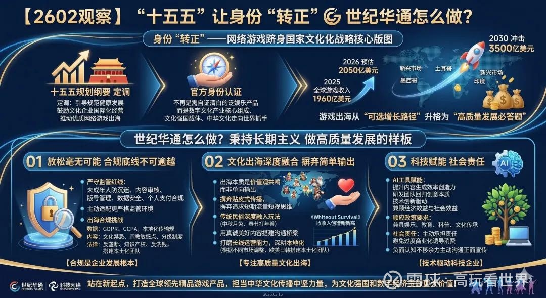 2026年全国两会顺利闭幕,《“十五五”规划纲要》重磅发布。对于整个游戏圈而言,这无疑是一颗史诗级的定心丸:网络游戏正式跻身国家数字文化产业核心版图。