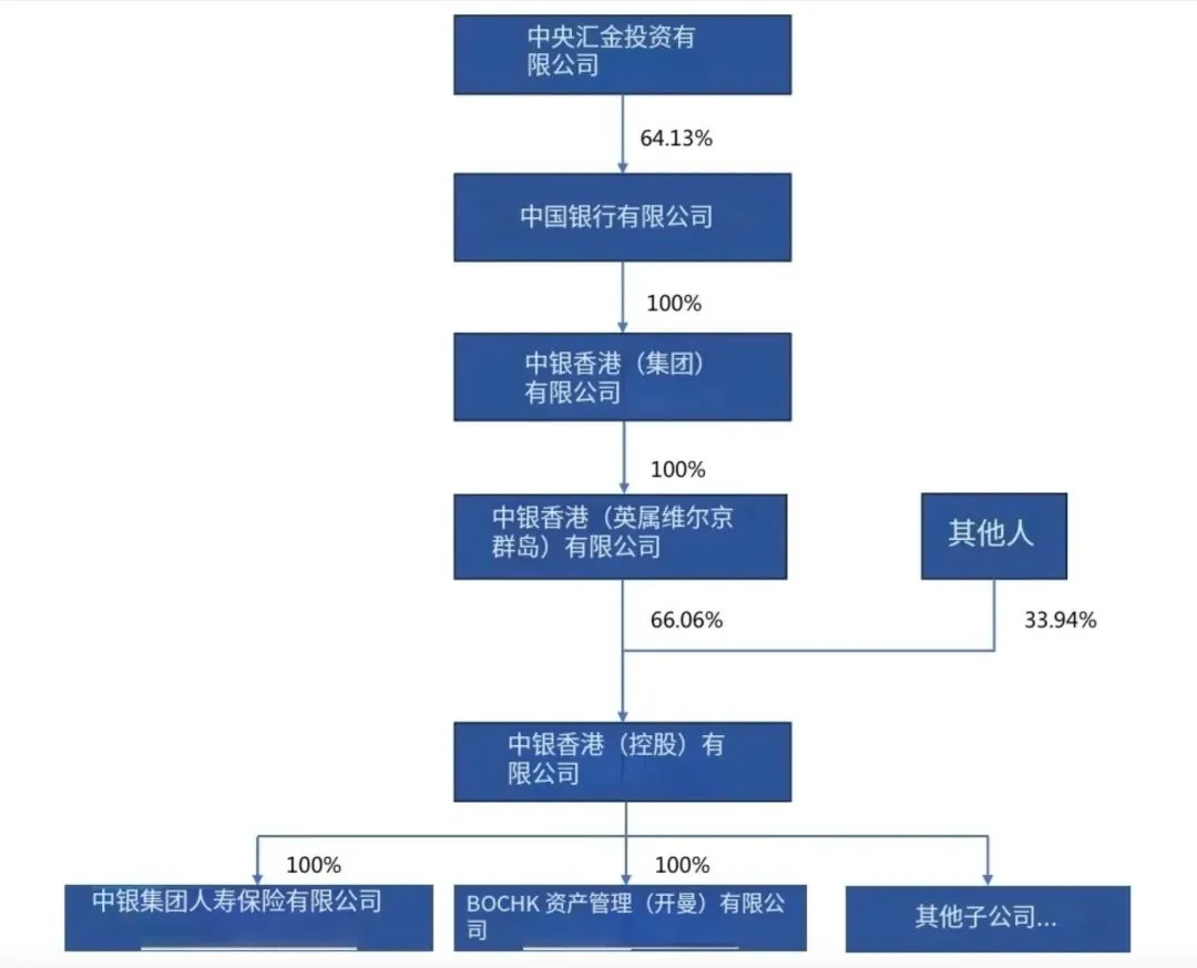 它就是中银香港。四大国行之一的中国银行是其母公司,实控人为中央汇金, 其股权关系如下: