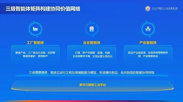 在与行业客户的联合创新实践中,新华三通过差异化解决方案展现了工业智能体在多层次场景中的应用价值。在工厂智能体层面,新华三助力祥邦科技打造了国家级智能工厂,实现生产效率提升35%、综合成本降低18%、产品合格率提升9%;在企业智能体层面,为环球印务构建集团数据中枢,打通研发、生产、质量全业务链路,实现一体化运营;在产业智能体层面,为咸阳高新区构建产业智能服务平台,提供AI赋能、供需对接等多元化服务,形成产业协同价值体系。