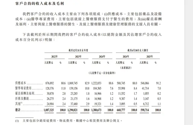 从招股书数据来看,2025年上半年,在客户合约成本中,占比达到91%的是供应成本,这个供应成本包括药品以及设备成本,这些都是不可变成本。