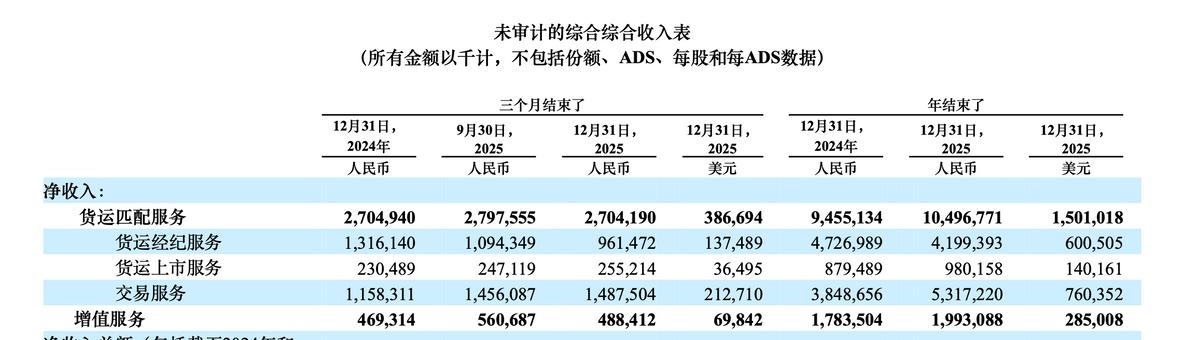 财报显示,Q4货运经纪服务营收9.615亿元人民币,2024年同期为13.161亿元人民币。