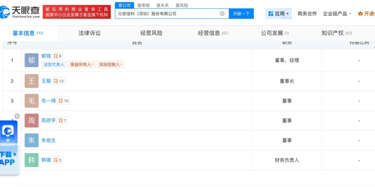 天眼查APP显示,众安信科的执行董事兼行政总裁郁锋、财务总监兼联席公司秘书周政宇,以及董事会主席王敏、技术总监兼副总裁毛一烽们,也都有过在“众安在线”或“众安科技”任职的经历。