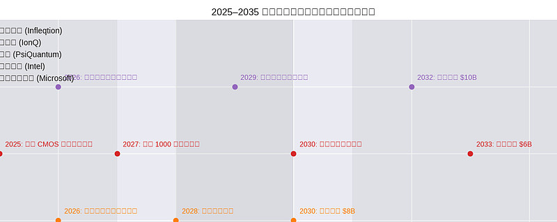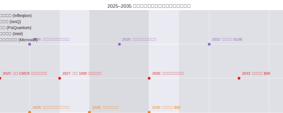 这张时间线图展示了从 2025 到 2035 年之间,五大主流量子技术路径的关键技术演进节点与估值重估时点。它将你关注的高成长公司(如 Infleqtion、IonQ、PsiQuantum)与代表性技术架构(中性原子、离子阱、光子、硅基自旋、拓扑量子比特)整合在一个清晰的图谱中。
