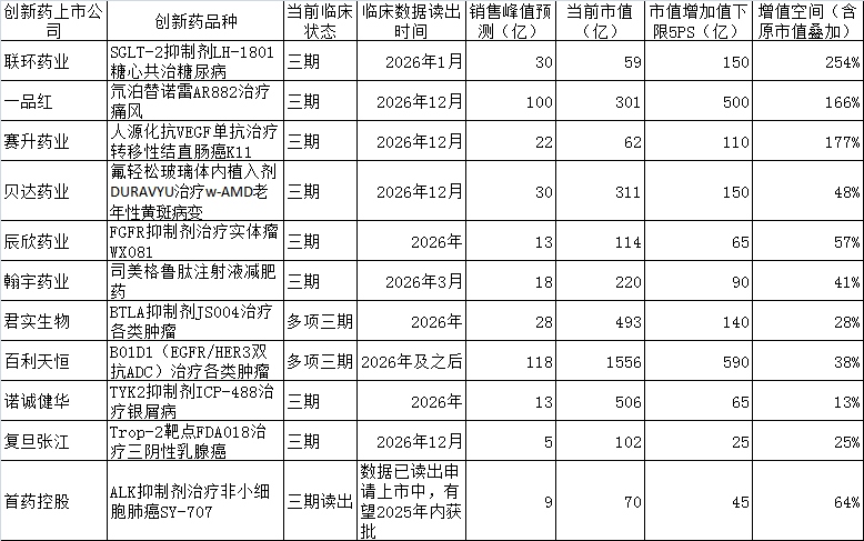 据不完全统计,2025年底至2026年有望完成创新药三期临床的上市公司有$联环药业(SH600513)$ SGLT-2抑制剂LH-1801治疗糖尿病(部分替代达格列净等竞品100亿市场,预期销售峰值约30亿)、$一品红(SZ300723)$ AR882氘泊替诺雷治疗老年性黄斑病变(预期销售峰值约100亿,含国内30亿,国际70亿)、赛升药业人源化抗VEGF单抗K11治疗转移性结直肠癌(部分替代贝伐珠单抗65亿市场,预期销售峰值约22亿)、贝达药业氟轻松玻璃体内植入剂DURAVYU治疗w-AMD(预期国内销售峰值约30亿,EyePoint拥有国际权益)、辰欣药业FGFR抑制剂WX081治疗实体瘤(预期销售峰值约13亿)、君实生物BTLA抑制剂JS004治疗各类肿瘤(预期销售峰值约28亿元,全球权益)、百利天恒EGFR/HER3双抗ADC B01D1治疗各类肿瘤(预期销售峰值约118亿元,含国内销售+国际权益分成)、翰宇药业司美格鲁肽注射液减肥药(预期销售峰值约18亿)、复旦张江Trop-2靶点FDA018治疗三阴性乳腺癌(预期销售峰值约5亿元)、首药控股ALK抑制剂SY-707治疗非小细胞肺癌(预期销售峰值约9亿元)、诺诚健华TYK2抑制剂ICP-488治疗银屑病(预期销售峰值约13亿元)等。综合对比相关个股当前市值与三期临床落地后带来的市值增长预期,联环药业预期市值增长空间为最高(参考下图)。