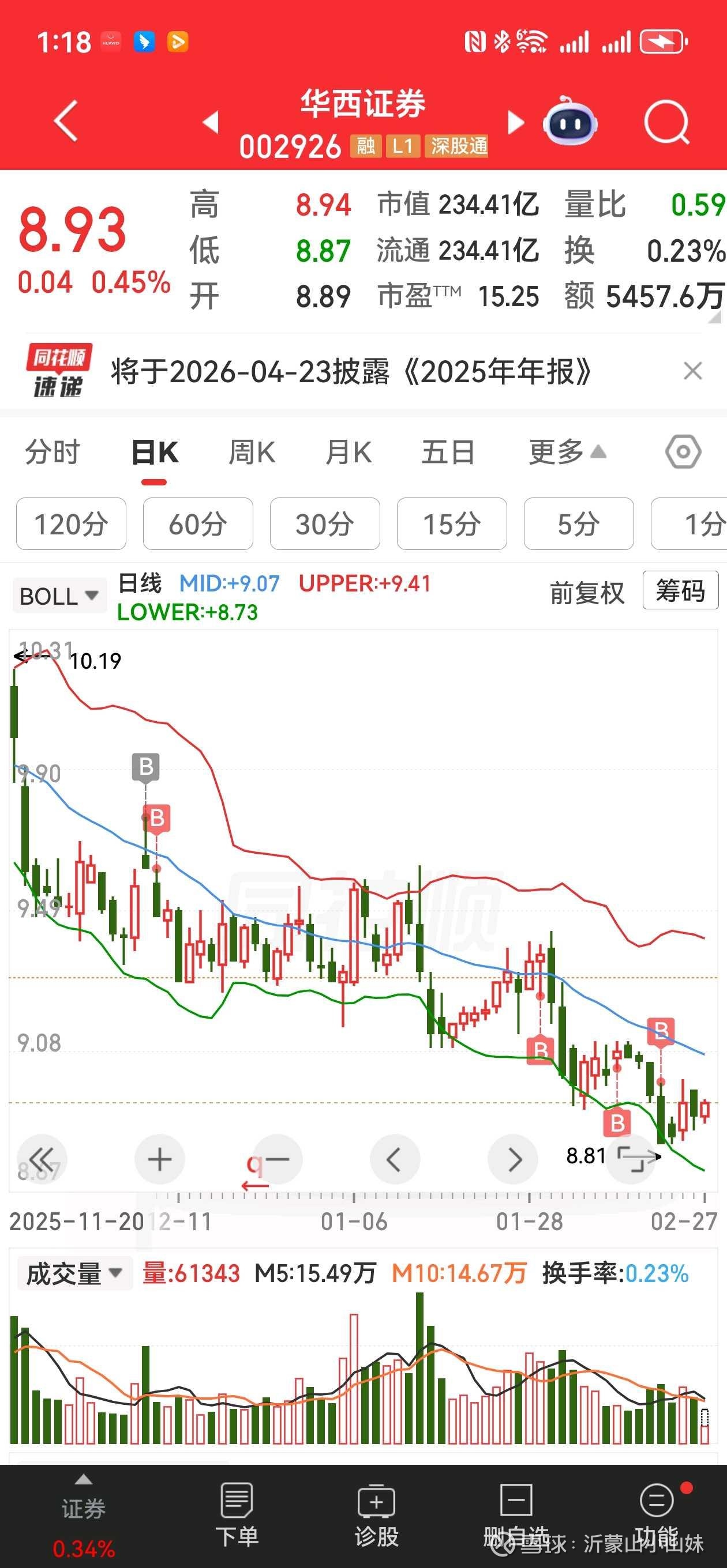正如你所言,现在守住就是赢。截至2月27日中午,华西证券股价报8.96元,微涨0.79%。此时市盈率(TTM)约15.34倍,相比其高增速的业绩表现,估值处于合理偏低的区间,性价比非常高。