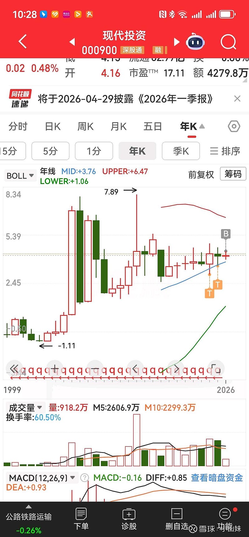 当前现代投资年线企稳回升,估值处于历史低位,市净率不足0.9倍,安全边际极高。高速主业稳现金流、光伏业务高成长、高股息强回报的三重优势共振,兼具价值与成长属性。无需纠结短期波动,立足中长期视角,坚定持股静待价值修复,有望收获业绩增长与估值提升的双重红利。