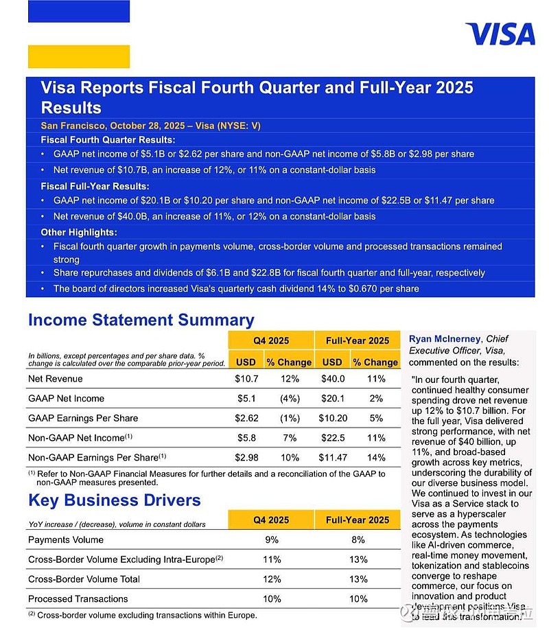 “在整个财年,Visa 交出了强劲业绩,营收 400 亿美元,同比增长 11%,关键指标实现全面增长,凸显我们多元化商业模式的持久韧性。”