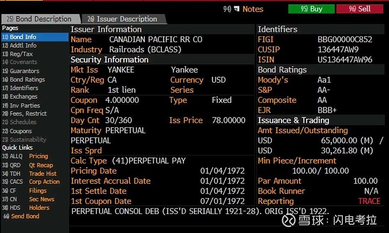 一个古董级债券,加拿大太平洋铁路公司永续一级债。为了支持从东海岸魁北克到西海岸温哥华的铁路建设,1922年发行,票面利率4%,现在还在交易,信用评级还很高。这些债券熬过了30年代大萧条、40年代二战、70年代滞胀、2008金融危机、2020疫情。持有人换了几代人了,但利息还在继续支付。永续资产匹配永续债券。#财富故事汇#