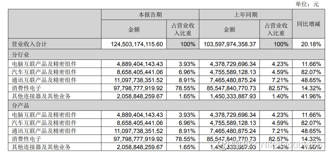 1. 立讯精密有78.5% 的业务来自于消费性电子, 其中56.3%来自苹果,22.2%来自于其他厂商。 这部分的营业收入增速是14.32%。 消费性电子:为苹果及品牌商提供手机、耳机等消费电子精密零部件与整机组装代工。