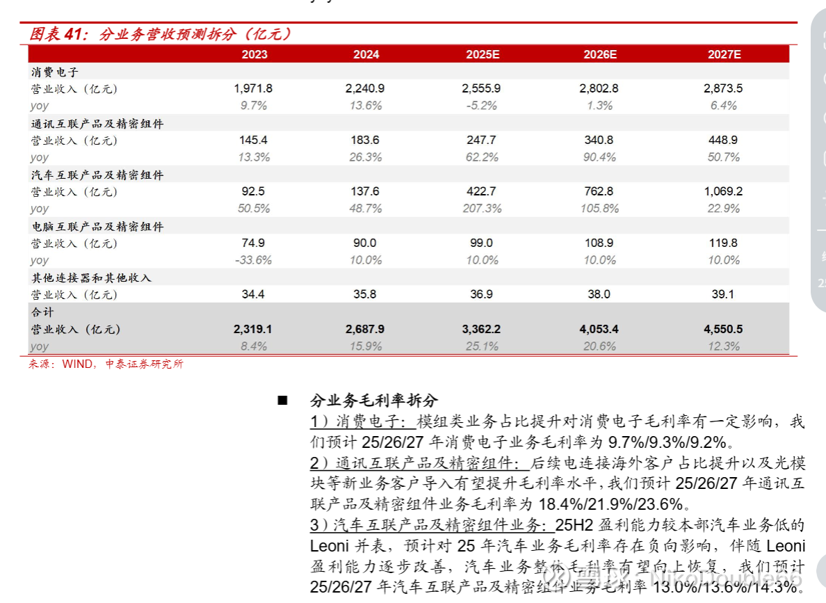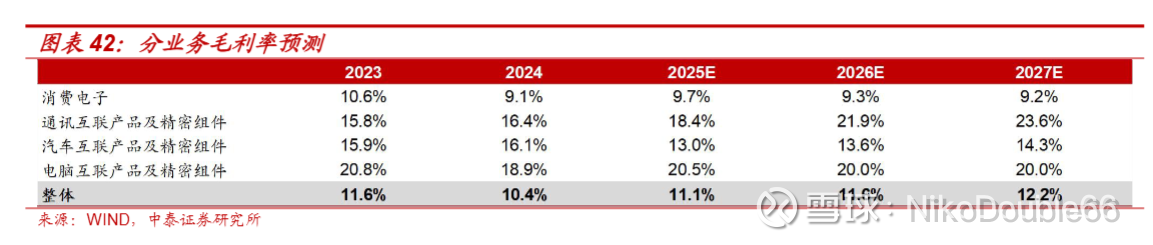 目前来看的是 占据总共20%收入的汽车 以及 AI通讯业务处于高增长区间,并且利润率比较高,没有太大问题。其中的关键问题在于占据立讯精密的消费性电子业务未来的发展如何,上图研报认为消费性电子的业务趋于下滑停止或者缓慢增长。
