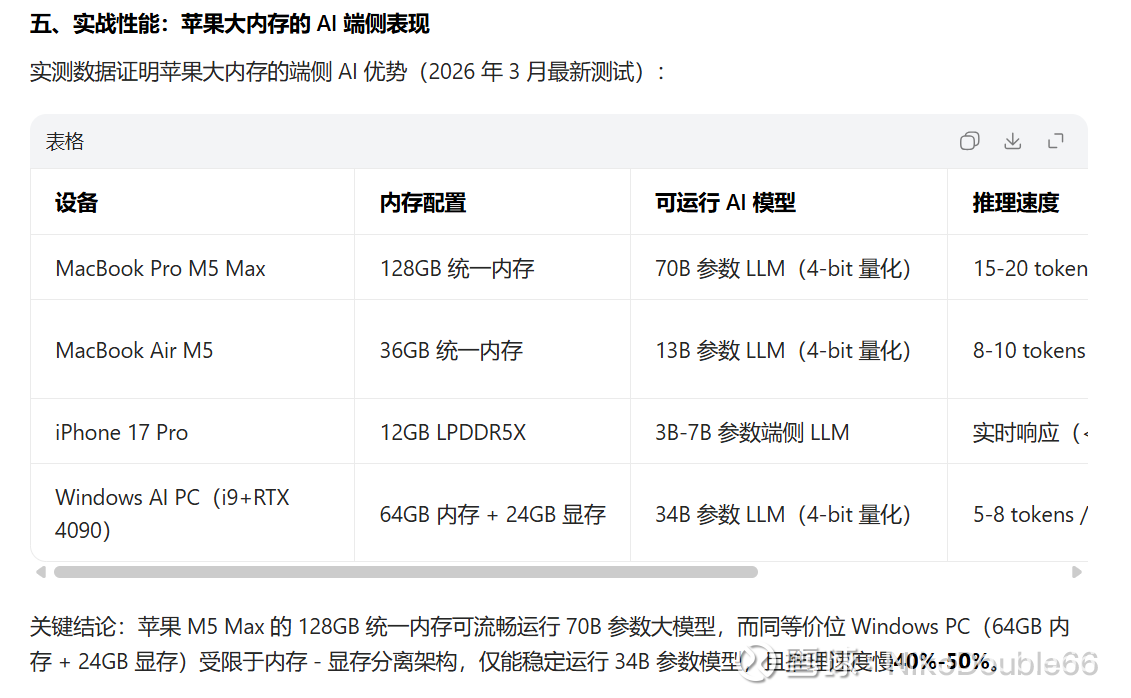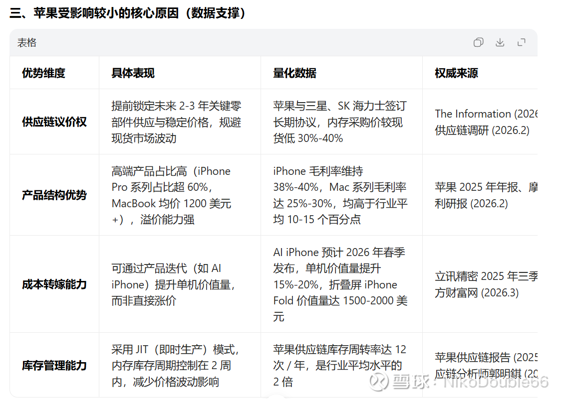 1. 苹果的硬件作为一个高端消费品, 受到通胀、经济增长有限的影响较少。 并且在2026到2028年期间,由于内存价格的上涨,电子消费品可能面临下滑。苹果由于强溢价能力和长期采购协定,受到的影响会少一些。对于苹果的笔记本业务,由于统一内存架构的存在以及良好的生态,让苹果成为AI端测得最佳部署平台,存在增长的空间。