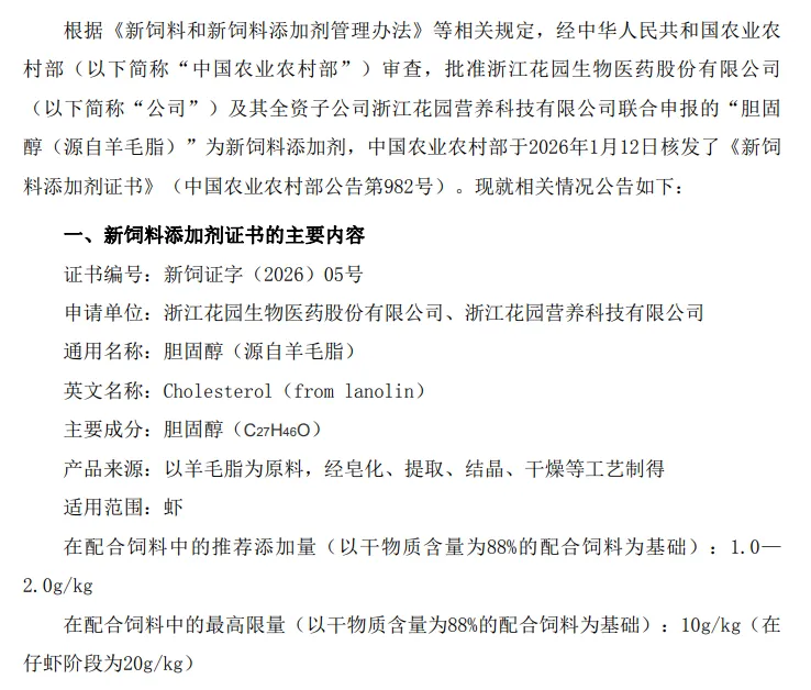然后,2026年初,政策一纸文书,“砰”一声,给这口古井扔了颗深水炸弹:允许胆固醇作为饲料添加剂,喂给虾吃!