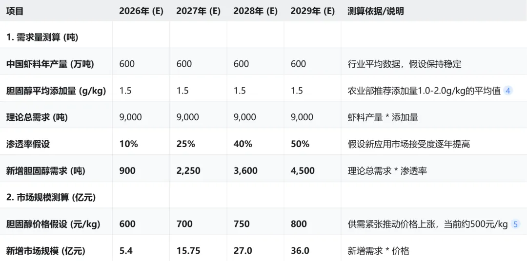 假设中国一年产600万吨虾饲料(行业公开数据大概在这附近)。新政推荐每吨饲料加1.5公斤胆固醇。哪怕只有10%的虾料先用起来(第一年很保守了),那就是:600万吨 × 1.5公斤/吨 × 10% = 900吨新增需求。