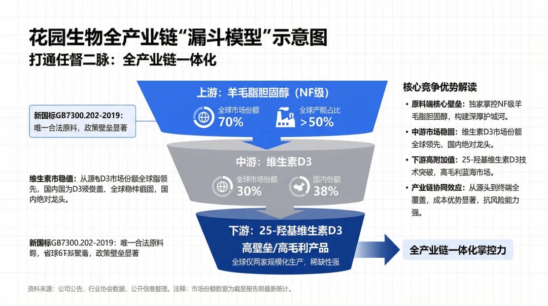 供给端呢? 巧了,坚固得像城堡。全球VD3产能本来就集中,而更上游的胆固醇,更是集中到令人发指——中国一家叫花园生物的公司,占了全球70%-80%的市场。 人家还是从羊毛脂开始,到胆固醇,再到VD3,全产业链打通,成本低到对手绝望。