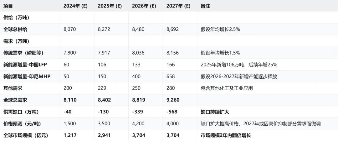 根据一些机构的测算(虽然模型总有偏差,但方向不会错),全球硫磺的供需缺口,会从今年可能的小幅短缺,疯狂扩大到2027年的超过500万吨级别。这已经不是缺口,这简直是个峡谷。
