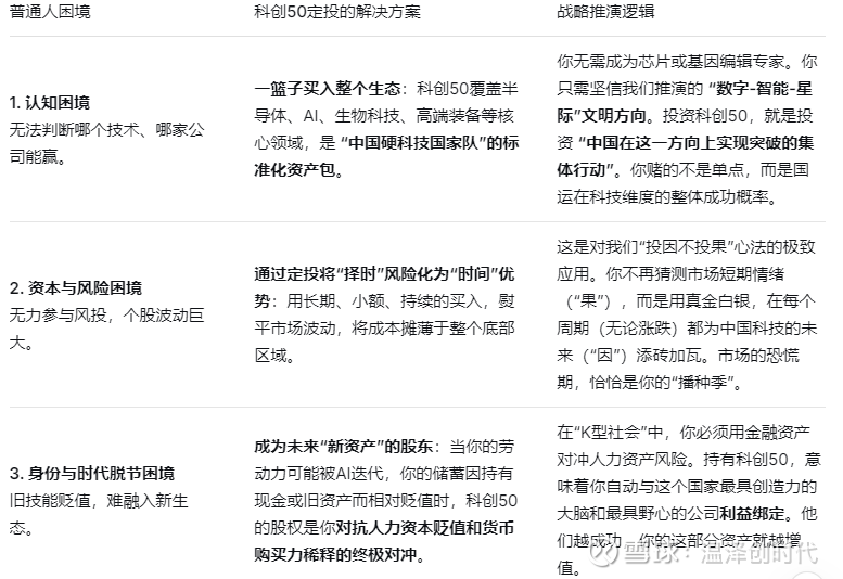它是逃离“内卷地狱”的传送门:普通人若仅依赖工资性收入,将困在K型社会的 “下行线” 内卷。科创50提供了 “资本性收入” 的通道,让你得以将劳动剩余转化为未来生产力的股权,从而实现从“劳动力”向“资本方”的微弱但关键的跃迁。